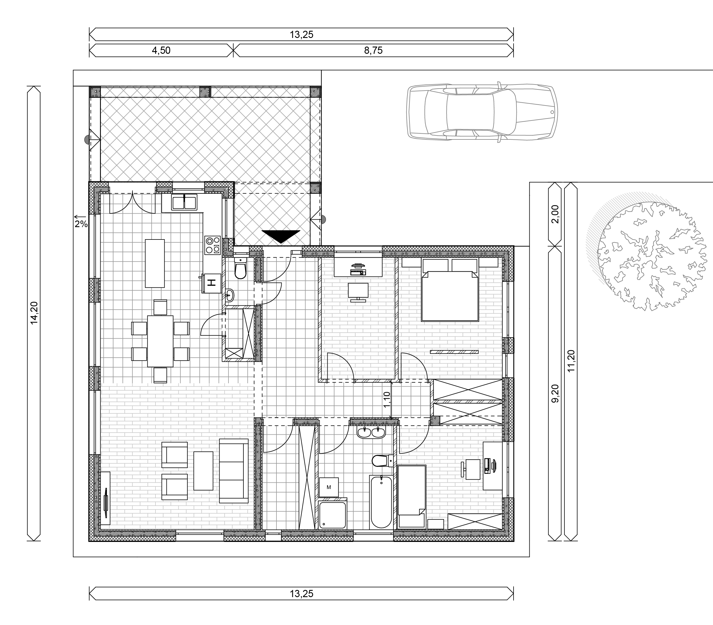 Das Gebäude ist für freistehendes oder grundstücksgrenzendes Stehen geeignet, empfohlen für Familien mit einem Kind.