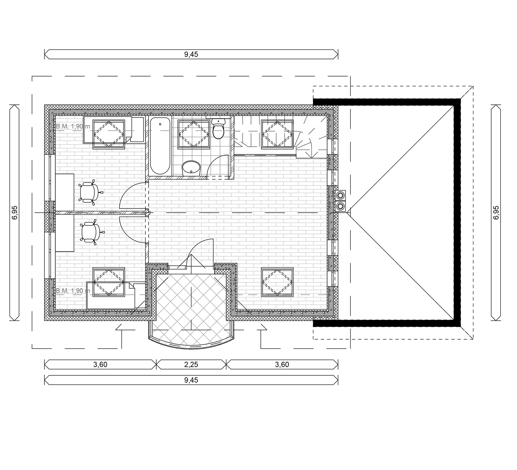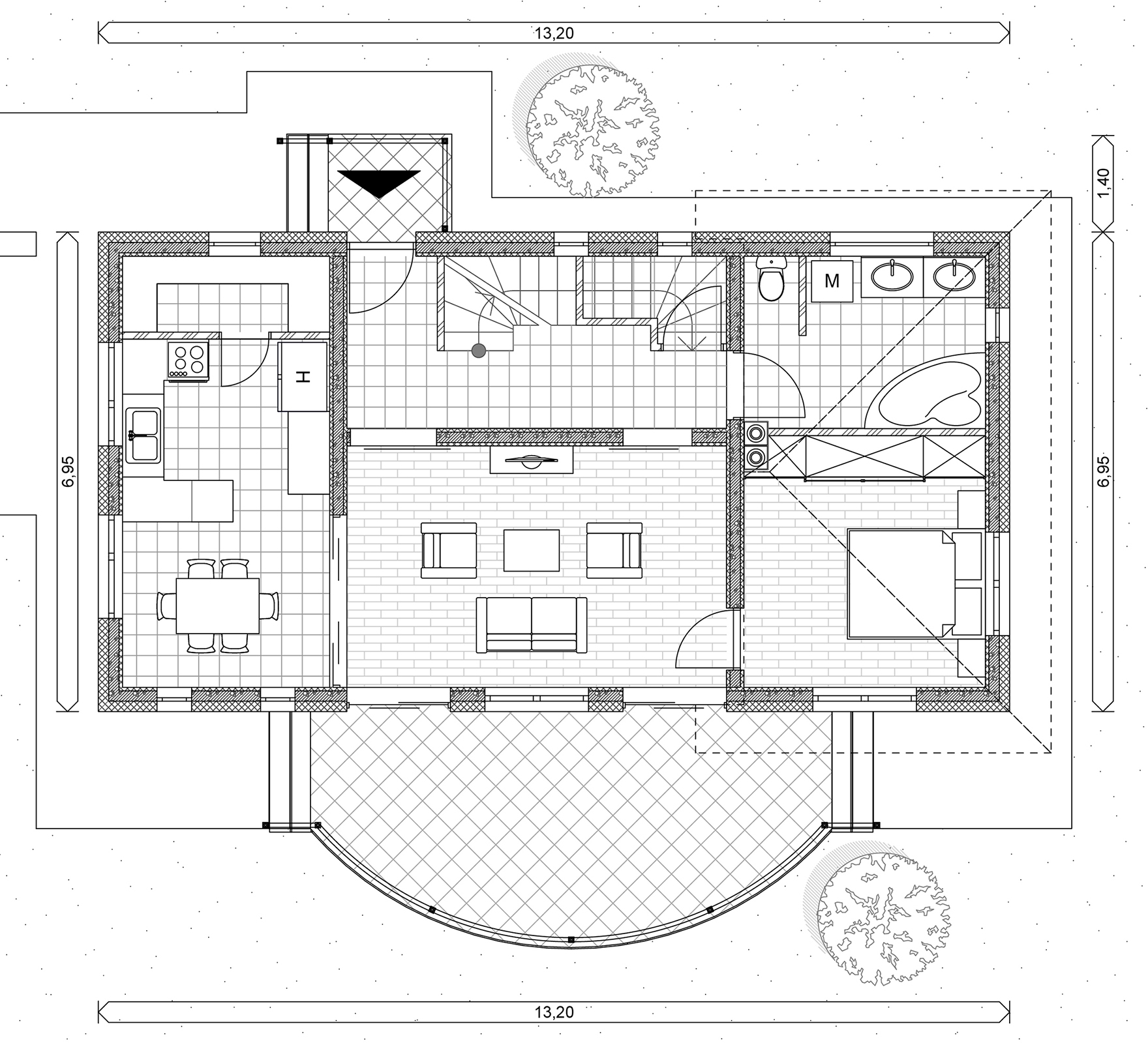 Das Gebäude ist für freistehendes oder grundstücksgrenzendes Stehen geeignet, empfohlen für Familien mit zwei Kindern.